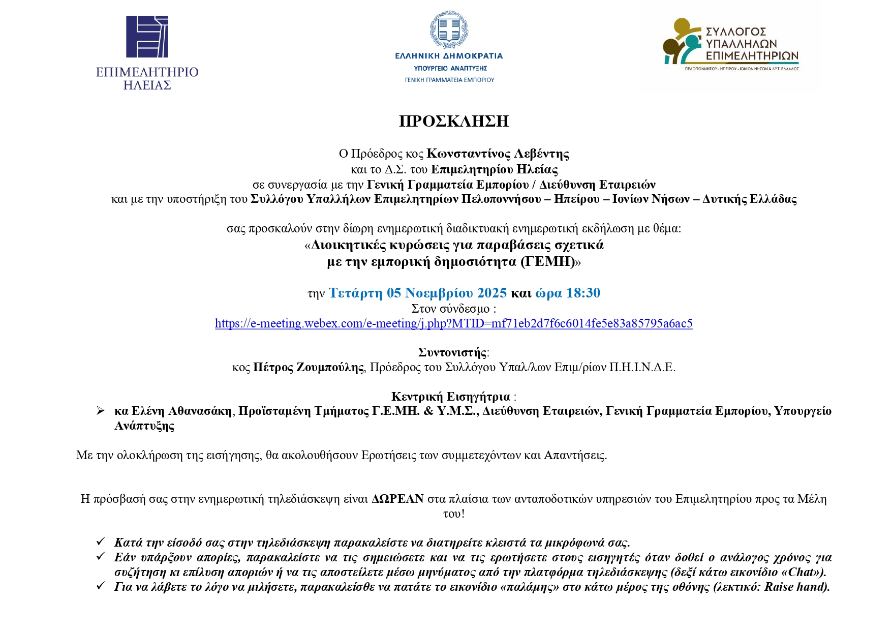 Δωρεάν Σεμινάριο του Επιμελητηρίου Ηλείας για τα μέλη του με θέμα: «Διοικητικές κυρώσεις για παραβάσεις σχετικά με την εμπορική δημοσιότητα (ΓΕΜΗ» Τετάρτη, 5 Νοεμβρίου 2025, στις 18:30 ΔΙΑΔΙΚΤΥΑΚΑ