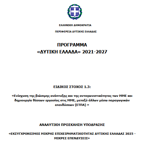 Πρόσκληση 1.iii.1γ2 «ΕΚΣΥΓΧΡΟΝΙΣΜΟΣ ΜΙΚΡΗΣ ΕΠΙΧΕΙΡΗΜΑΤΙΚΟΤΗΤΑΣ ΔΥΤΙΚΗΣ ΕΛΛΑΔΑΣ 2025 – ΜΙΚΡΕΣ ΕΠΕΝΔΥΣΕΙΣ» του Προγράμματος «Δυτική Ελλάδα 2021-2027» Η Ειδική Υπηρεσία Διαχείρισης Ε.Π. Περιφέρειας Δυτικής Ελλάδας προβαίνει στην Πρόσκληση με κωδικό 1.iii.1γ2 και τίτλο: «ΕΚΣΥΓΧΡΟΝΙΣΜΟΣ ΜΙΚΡΗΣ ΕΠΙΧΕΙΡΗΜΑΤΙΚΟΤΗΤΑΣ ΔΥΤΙΚΗΣ ΕΛΛΑΔΑΣ 2025 – ΜΙΚΡΕΣ ΕΠΕΝΔΥΣΕΙΣ» ΑΝΑΛΥΤΙΚΕΣ ΠΛΗΡΟΦΟΡΙΕΣ ΑΠΟ ΤΗ “ΔΙΑΧΕΙΡΙΣΤΙΚΗ ΕΥΡΩΠΑΪΚΩΝ ΠΡΟΓΡΑΜΜΑΤΩΝ” (ΤΗΛ. 2610622711, email efd@diaxeiristiki.gr και pep@diaxeiristiki.gr) […]