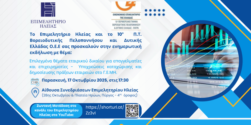 Στο Επιμελητήριο Ηλείας κατανοούμε τις καθημερινές σας προκλήσεις. Γι’ αυτό, στεκόμαστε δίπλα σας, διοργανώνοντας στοχευμένες δράσεις για την υποστήριξή σας. Γνωρίζοντας πόσο κρίσιμη είναι η έγκυρη ενημέρωση για την εύρυθμη λειτουργία της επιχείρησής σας, αναλάβαμε την πρωτοβουλία, σε συνεργασία με το Οικονομικό Επιμελητήριο, να διοργανώσουμε μια εξαιρετικά χρήσιμη εκδήλωση. Σας προσκαλούμε, σε δωρεάν ενημερωτικό σεμινάριο […]